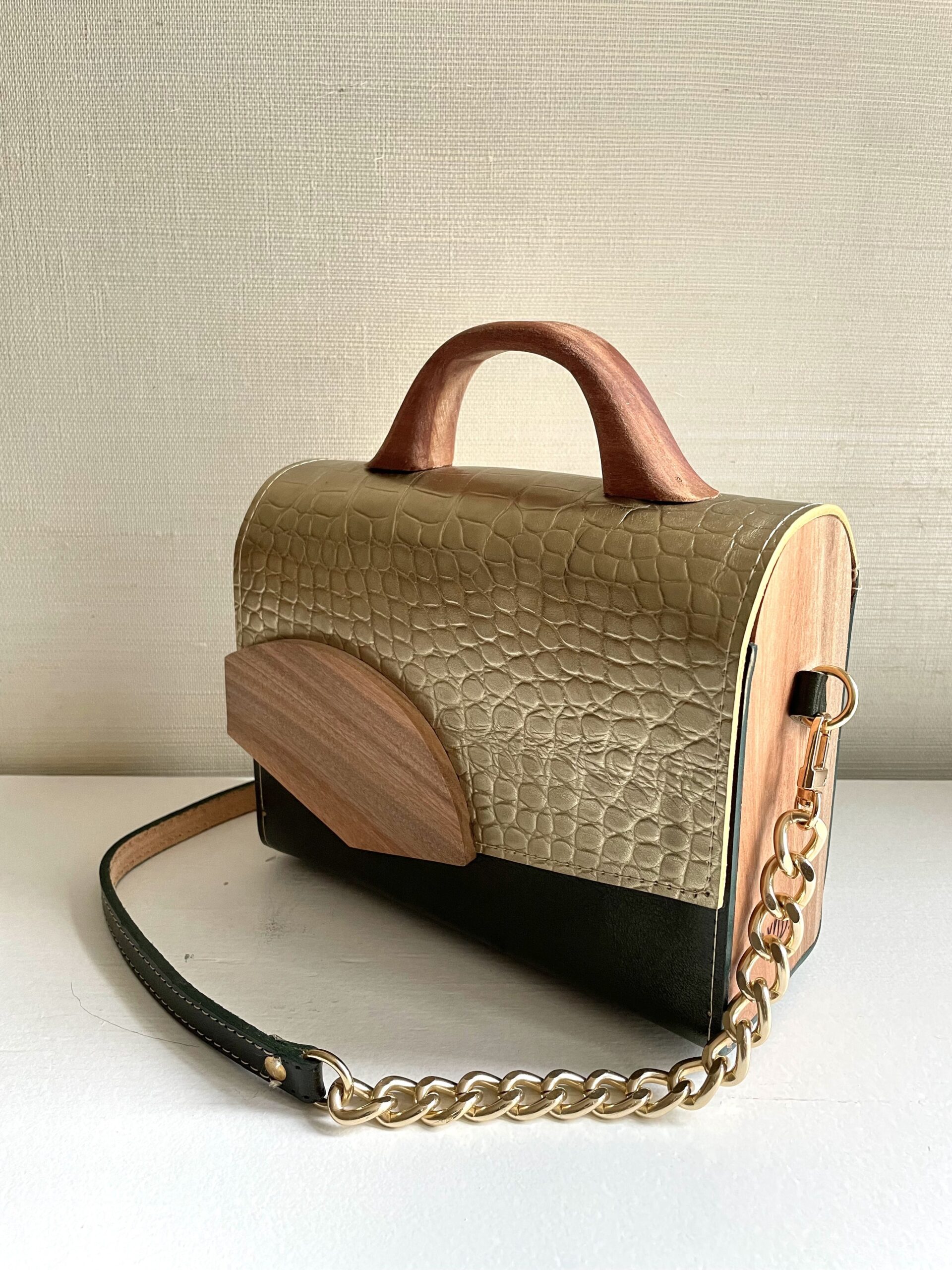 A shiny showpiece, this handbag combines quality materials and craftsmanship with timeless design to add a gold pop to your outfit. Featuring a gold crocodile embossed flap, dark green leather base, and wood details, this handbag is structured, elegant, and roomy enough to fit all your essentials. Carry it by its top handle or as a shoulder bag with a detachable chain.